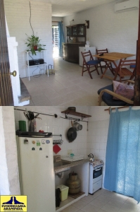 En la Planta baja tiene un estar con estufa a leña y Aire acondicionado (AC), cocina semi- integrada al estar, un baño completo y un dormitorio con tres camas. En la